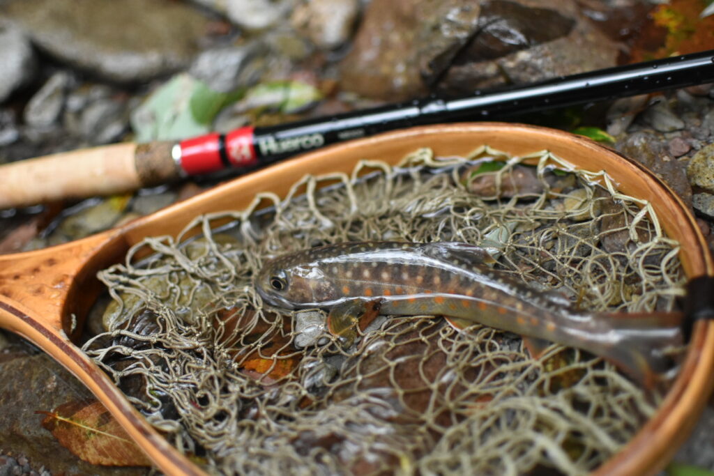 かわいいイワナが掛かりましたが、抜き上げたと同時にバレてしましました。